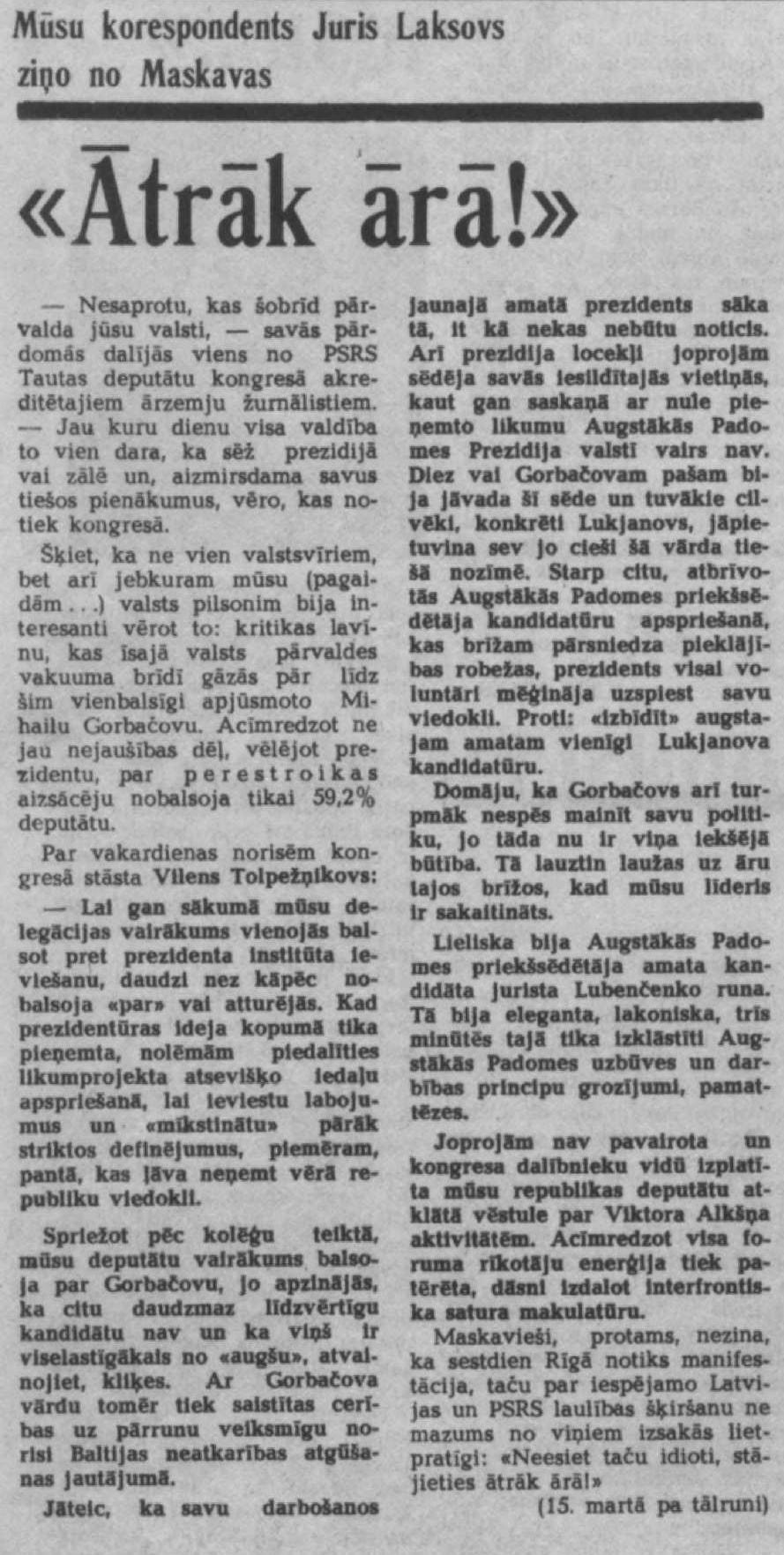 Spriežot pēc kolēģu teiktā, mūsu deputātu vairākums balsoja par Gorbačovu, jo apzinājās, ka citu daudzmaz līdzvērtīgu kandidātu nav un ka viņš ir viselastīgākais no «augšu», atvainojiet, kliķes. Ar Gorbačova vārdu tomēr tiek saistītas cerības uz pārrunu veiksmīgu norisi Baltijas neatkarības atgūšanas jautājumā.