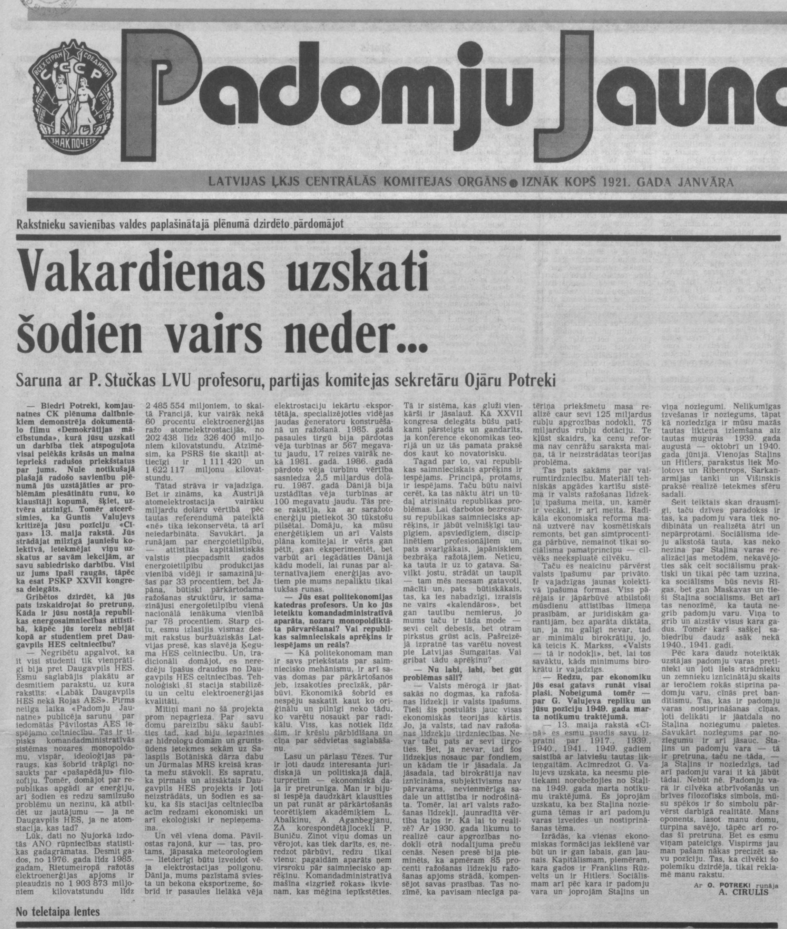 Tātad strāva ir vajadzīga. Bet ir zināms, ka Austrijā atomelektrostacija vairāku miljardu dolāru vērtībā pēc tautas referendumā pateiktā «nē» tika iekonservēta, tā arī neiedarbināta. Savukārt, ja runājam par energoietilpību, — attīstītās kapitālistiskās valstis piecpadsmit gados energoietilpību produkcijas vienībā vidēji ir samazinājušas par 33 procentiem, bet Japāna. būtiski pārkārtodama ražošanas struktūru, ir samazinājusi energoietilpību vienā nacionālā ienākuma vienībā par 78 procentiem. Starp citu, esmu izlasījis vismaz desmit rakstus buržuāziskās Latvijas presē, kas slavēja Ķeguma HES celtniecību. Un, tradicionāli domājot, es neredzēju īpašus draudus no Daugavpils HES celtniecības. Tehnoloģiski šī stacija stabilizētu un celtu elektroenerģijas kvalitāti.