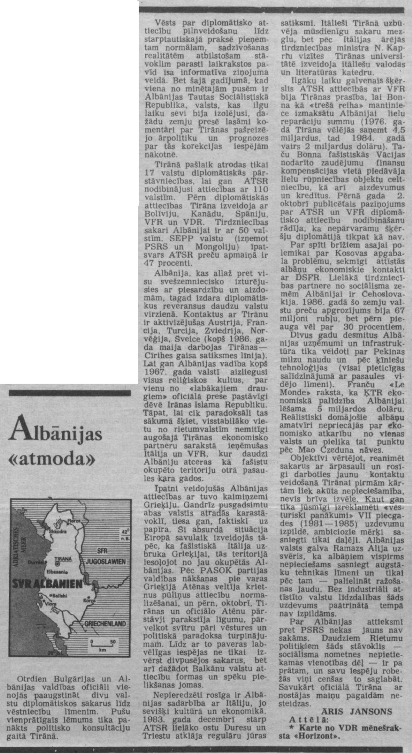 Vēsts par diplomātisko attiecību pilnveidošanu līdz starptautiskajā praksē pieņemtam normālam, sadzīvošanas realitātēm atbilstošam stāvoklim parasti laikrakstos pavīd īsa informatīva ziņojuma veidā. Bet šajā gadījumā, kad viena no minētajām pusēm ir Albānijas Tautas Sociālistiskā Republika, valsts, kas ilgu laiku sevi bija izolējusi, dažādu zemju presē lasāmi komentāri par Tirānas pašreizējo ārpolitiku un prognozes par tās korekcijas iespējām nākotnē.