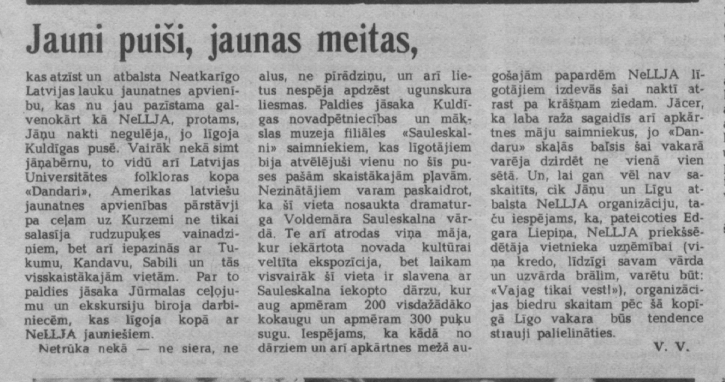 kas atzīst un atbalsta Neatkarīgo Latvijas lauku jaunatnes apvienību, kas nu jau pazīstama galvenokārt kā NeLLJA, protams, Jāņu nakti negulēja, jo līgoja Kuldīgas pusē. Vairāk nekā simt jāņabērnu, to vidū ari Latvijas Universitātes folkloras kopa «Dandari», Amerikas latviešu jaunatnes apvienības pārstāvji pa ceļam uz Kurzemi ne tikai salasīja rudzupuķes vainadziņiem, bet ari iepazinās ar Tukumu, Kandavu, Sabili un tās visskaistākajām vietām. Par to paldies jāsaka Jūrmalas ceļojumu un ekskursiju biroja darbiniecēm, kas līgoja kopā ar NeLLJA jauniešiem.