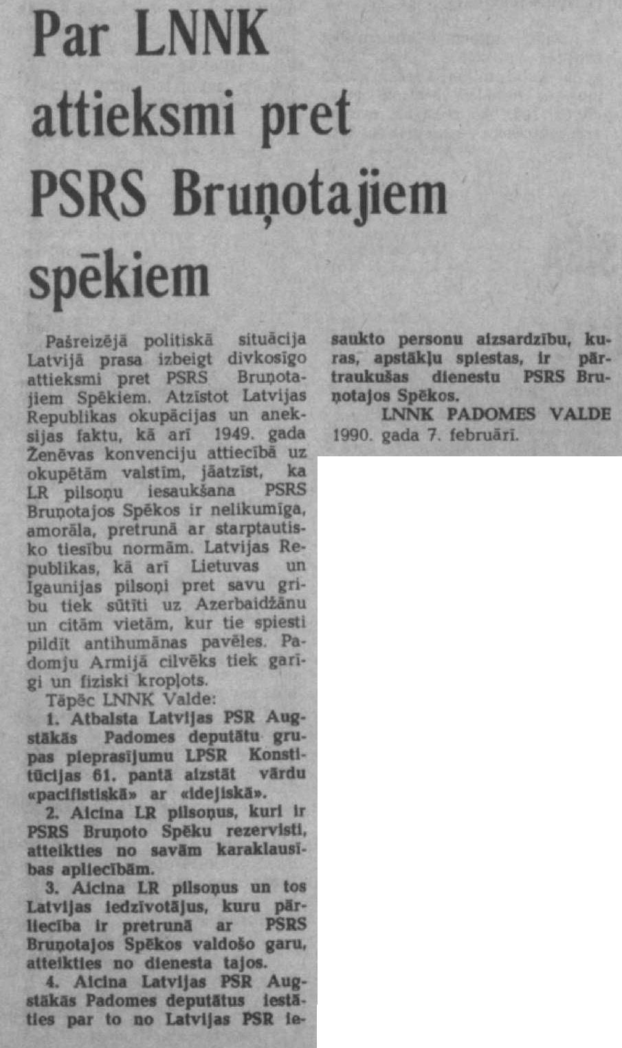 Pašreizējā politiskā situācija Latvijā prasa izbeigt divkosīgo attieksmi pret PSRS Bruņotajiem spēkiem. Atzīstot Latvijas Republikas okupācijas un aneksijas faktu, kā arī 1949. gada Ženēvas konvenciju attiecībā uz okupētām valstīm, jāatzīst, ka LR pilsoņu iesaukšana PSRS Bruņotajos spēkos ir nelikumīga, amorāla, pretrunā ar starptautisko tiesību normām. Latvijas Republikas, kā arī Lietuvas un Igaunijas pilsoņi pret savu gribu tiek sūtīti uz Azerbaidžānu un citām vietām, kur tie spiesti pildīt antihumānas pavēles. Padomju armijā cilvēks tiek garīgi un fiziski kropļots.