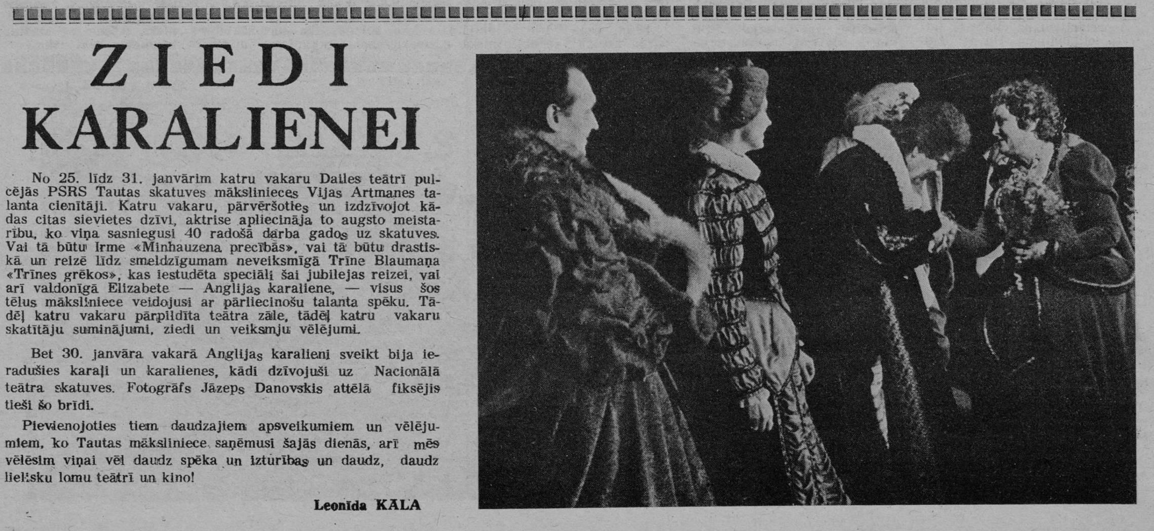 No 25. līdz 31. janvārim katru vakaru Dailes teātrī pulcējās PSRS Tautas skatuves mākslinieces Vijas Artrnanes talanta cienītāji. Katru vakaru, pārvēršoties un izdzīvojot kādas citas sievietes dzīvi, aktrise apliecināja to augsto meistarību, ko viņa sasniegusi 40 radošā darba gados uz skatuves. Vai tā būtu Irme «Minhauzena precībās», vai tā būtu drastiskā un reizē Līdz smeldzīgumam neveiksmīgā Trīne Blaumaņa «Trīnes grēkos», kas iestudēta speciāli šai jubilejas reizei, vai arī valdonīgā Elizabete — Anglijas karaliene, — visus šos tēlus māksliniece veidojusi ar pārliecinošu talanta spēku. Tādēļ katru vakaru pārpildīta teātra zāle, tādēļ katru vakaru skatītāju suminājumi, ziedi un veiksmju vēlējumi.