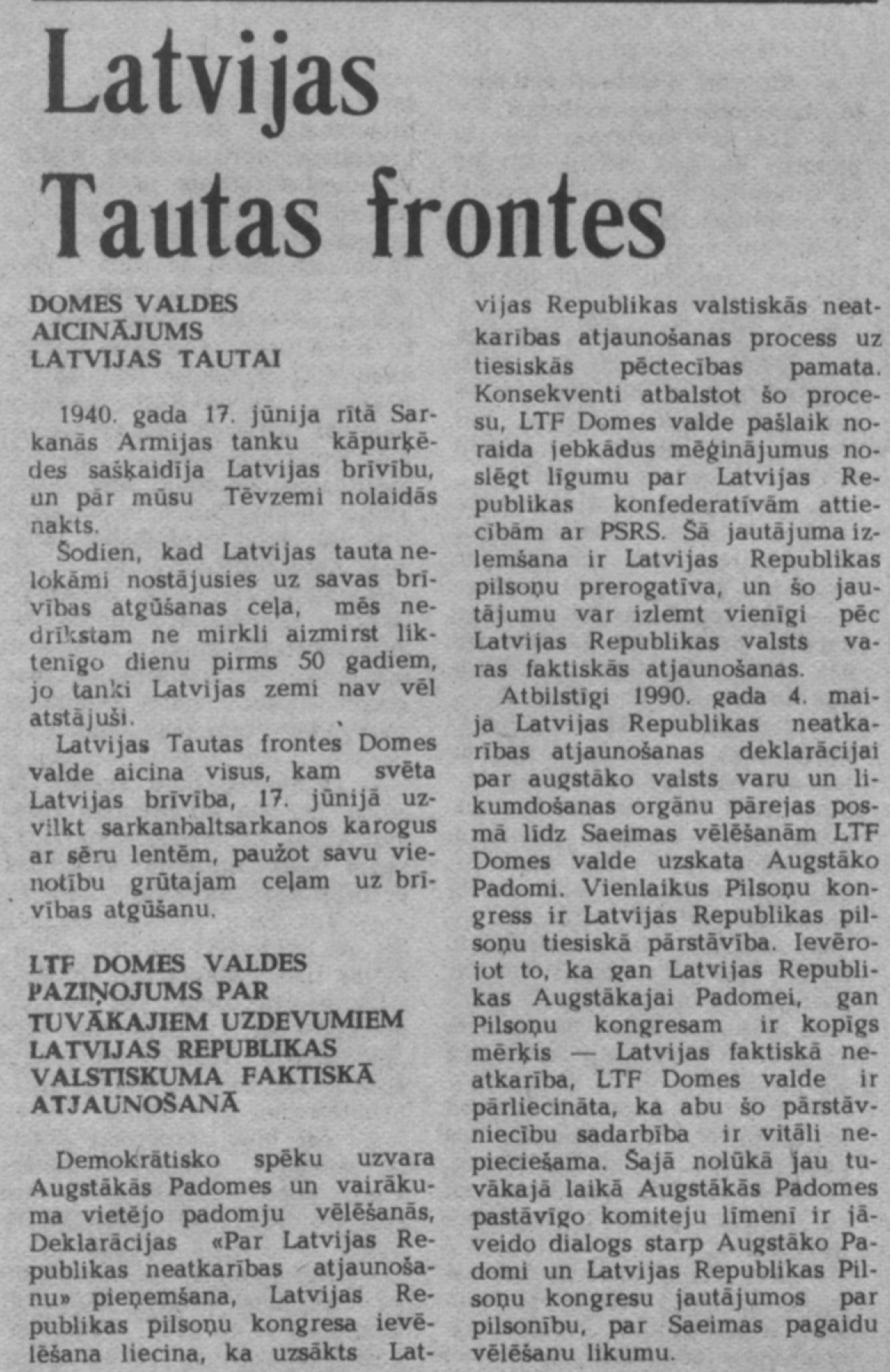 Demokrātisko spēku uzvara Augstākās Padomes un vairākuma vietējo padomju vēlēšanās, Deklarācijas «Par Latvijas Republikas neatkarības atjaunošanu» pieņemšana, Latvijas Republikas pilsoņu kongresa ievēlēšana liecina, ka uzsākts Latvijas Republikas valstiskās neatkarības atjaunošanas process uz tiesiskās pēctecības pamata. Konsekventi atbalstot šo procesu, LTF Domes valde pašlaik noraida jebkādus mēģinājumus noslēgt līgumu par Latvijas Republikas konfederatīvām attiecībām ar PSRS. Šā jautājuma izlemšana ir Latvijas Republikas pilsoņu prerogatīva, un šo jautājumu var izlemt vienīgi pēc Latvijas Republikas valsts varas faktiskās atjaunošanas.