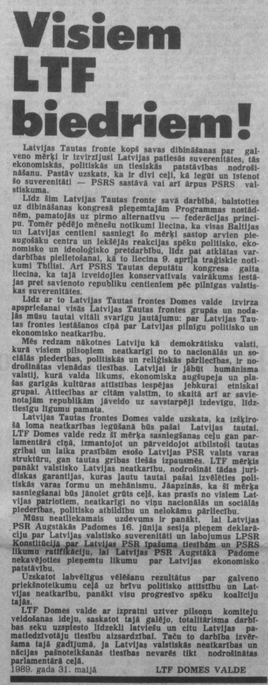 Līdz ar to Latvijas Tautas frontes Domes valde izvirza apspriešanai visās Latvijas Tautas frontes grupās un nodaļās mūsu tautai vitāli svarīgu jautājumu: par Latvijas Tautas frontes iestāšanos cīņā par Latvijas pilnīgu politisko un ekonomisko neatkarību.