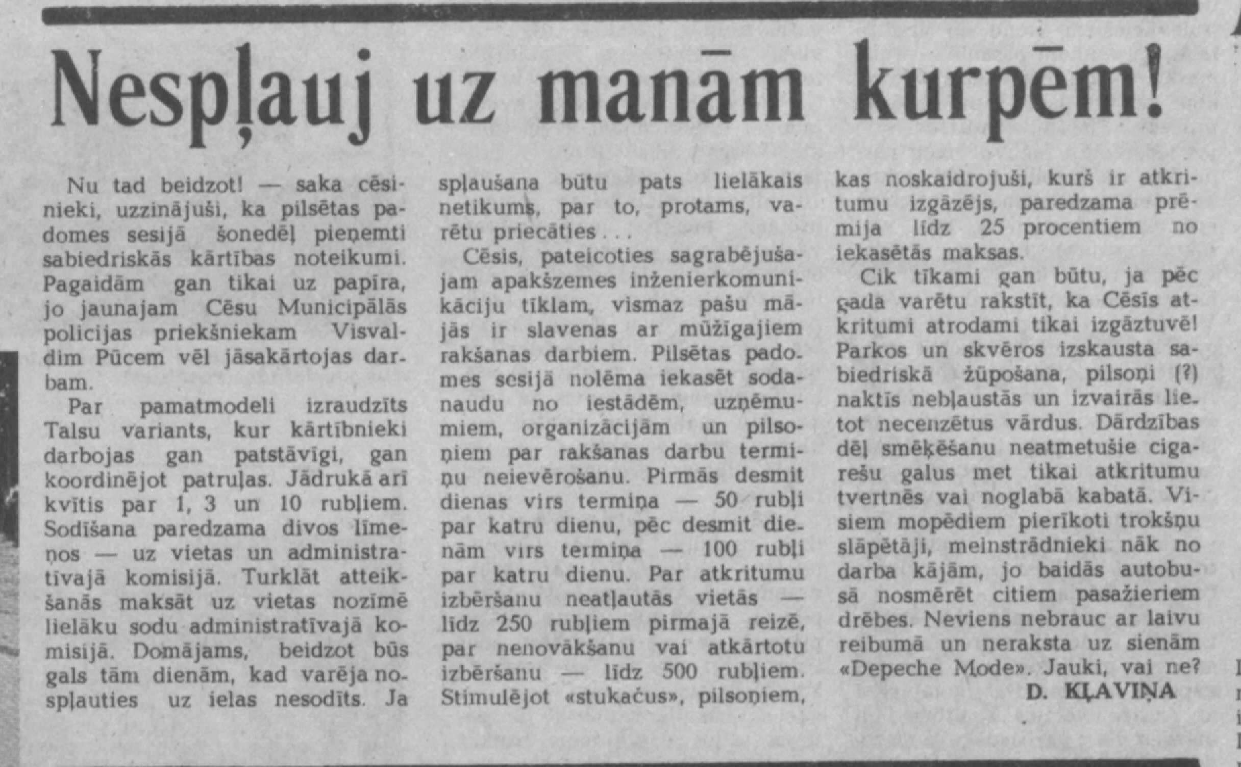 Cēsis, pateicoties sagrabējušajam apakšzemes inženierkomunikāciju tiklam, vismaz pašu mājās ir slavenas ar mūžīgajiem rakšanas darbiem. Pilsētas padomes sesija nolēma iekasēt sodanaudu no iestādēm, uzņēmumiem, organizācijām un pilsoņiem par rakšanas darbu termiņu neievērošanu. Pirmās desmit dienas virs termiņa — 50 rubli par katru dienu, pēc desmit dienam virs teimiņa — 100 rubli par katlu dienu. Par atkritumu izbēršanu neatļautās vietās — lidz 250 rubļiem pirmajā reizē, par nenovakšanu vai atkārtotu izbēršanu — lidz 500 rubļiem. Stimulējot «stukačus», pilsoņiem, kas noskaidrojuši, kurš ir atkritumu izgāzējs, paredzama prēmija lidz 25 procentiem no iekasētās maksas.
