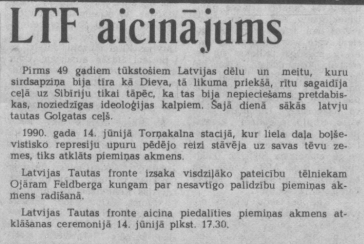 Latvijas Tautas fronte aicina piedalīties piemiņas akmens atklāšanas ceremonijā 14. jūnijā plkst. 17.30.