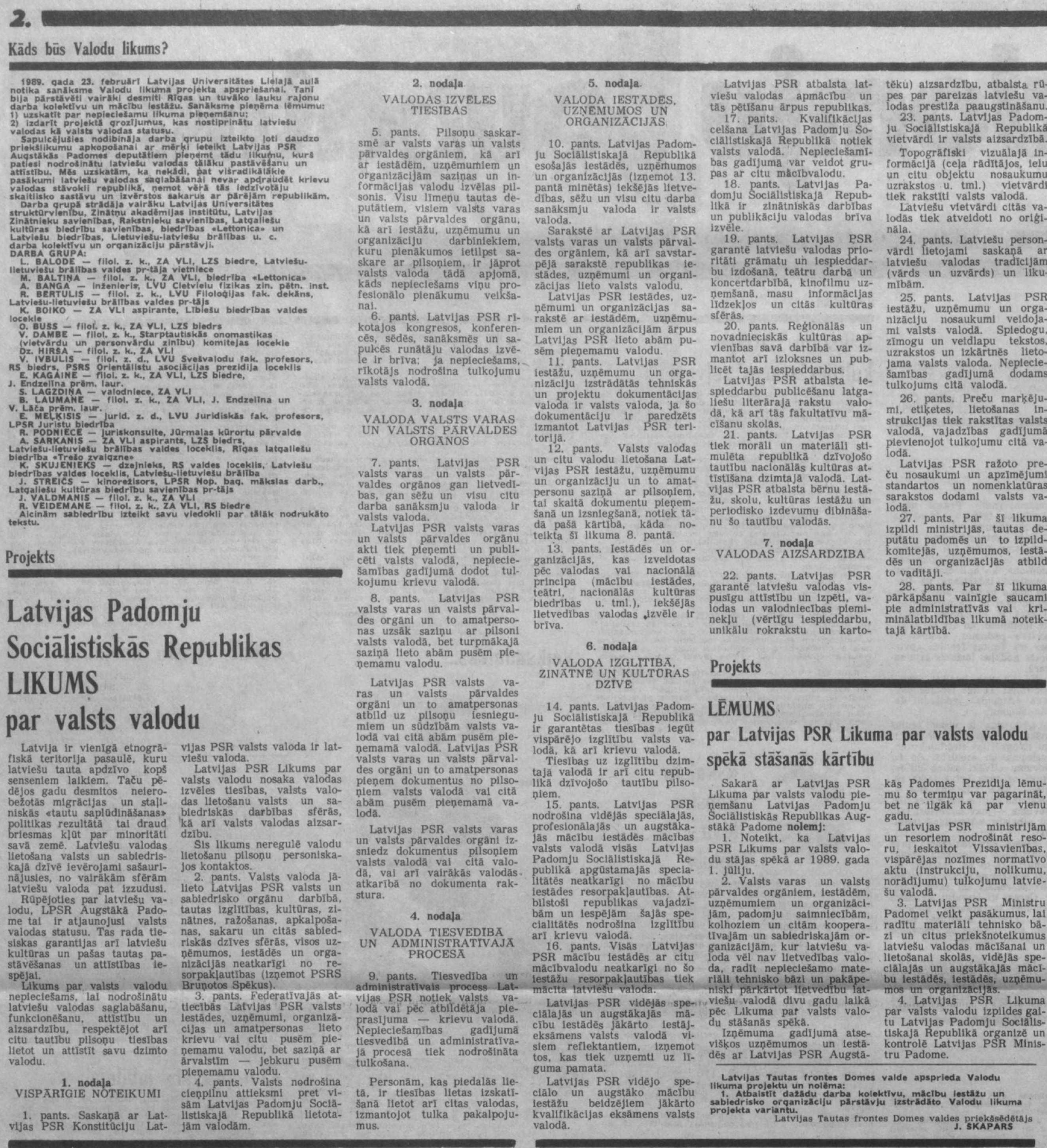 2. Valsts varas un valsts pārvaldes orgāniem, iestādēm, uzņēmumiem un organizācijām, padomju saimniecībām, kolhoziem un citām kooperatīvajām un sabiedriskajām organizācijām, kur latviešu valoda vēl nav lietvedības valoda, radīt nepieciešamo materiāli tehnisko bāzi un pakāpeniski pārkārtot lietvedību latviešu valodā divu gadu laikā pēc Likuma par valsts valodu stāšanās spēkā.