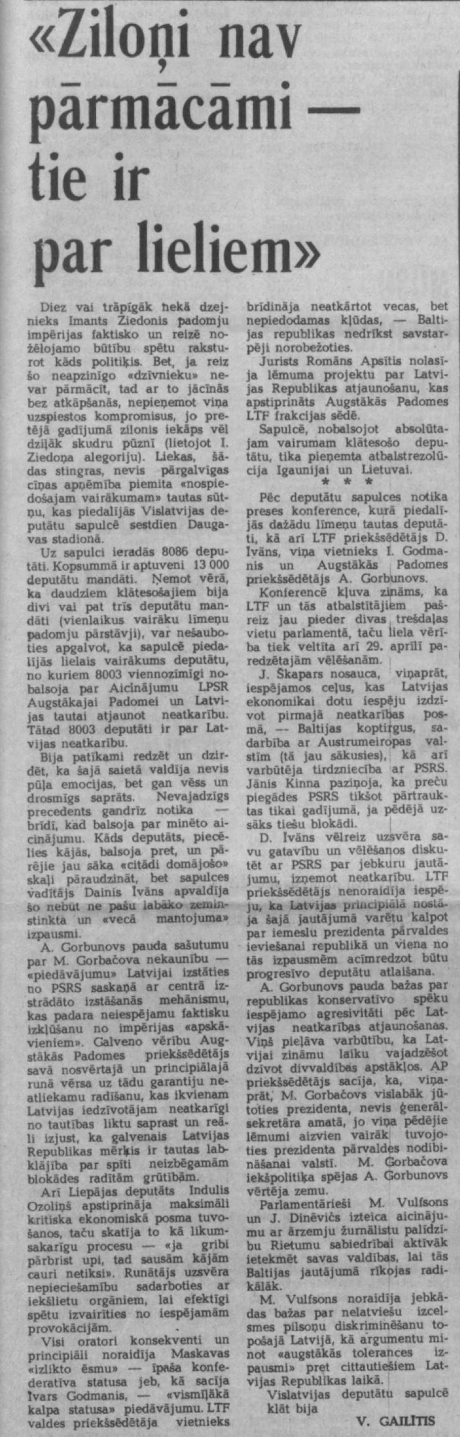 Diez vai trāpīgāk nekā dzejnieks Imants Ziedonis padomju impērijas faktisko un reizē nožēlojamo būtību spētu raksturot kāds politiķis. Bet, ja reiz šo neapzinīgo «dzīvnieku» nevar pārmācīt, tad ar to jācīnās bez atkāpšanās, nepieņemot viņa uzspiestos kompromisus, jo pretējā gadījumā zilonis iekāps vēl dziļāk skudru pūznī (lietojot I. Ziedoņa alegoriju). Liekas, šādas stingras, nevis pārgalvīgas cīņas apņēmība piemita «nospiedošajam vairākumam» tautas sūtņu, kas piedalījās Vislatvijas deputātu sapulcē sestdien Daugavas stadionā.