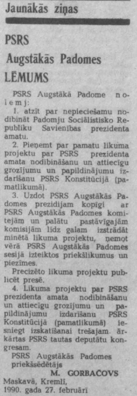 2. Pieņemt par pamatu likuma projektu par PSRS prezidenta amata nodibināšanu un attiecīgu grozījumu un papildinājumu izdarīšanu PSRS Konstitūcijā (Pamatlikumā).