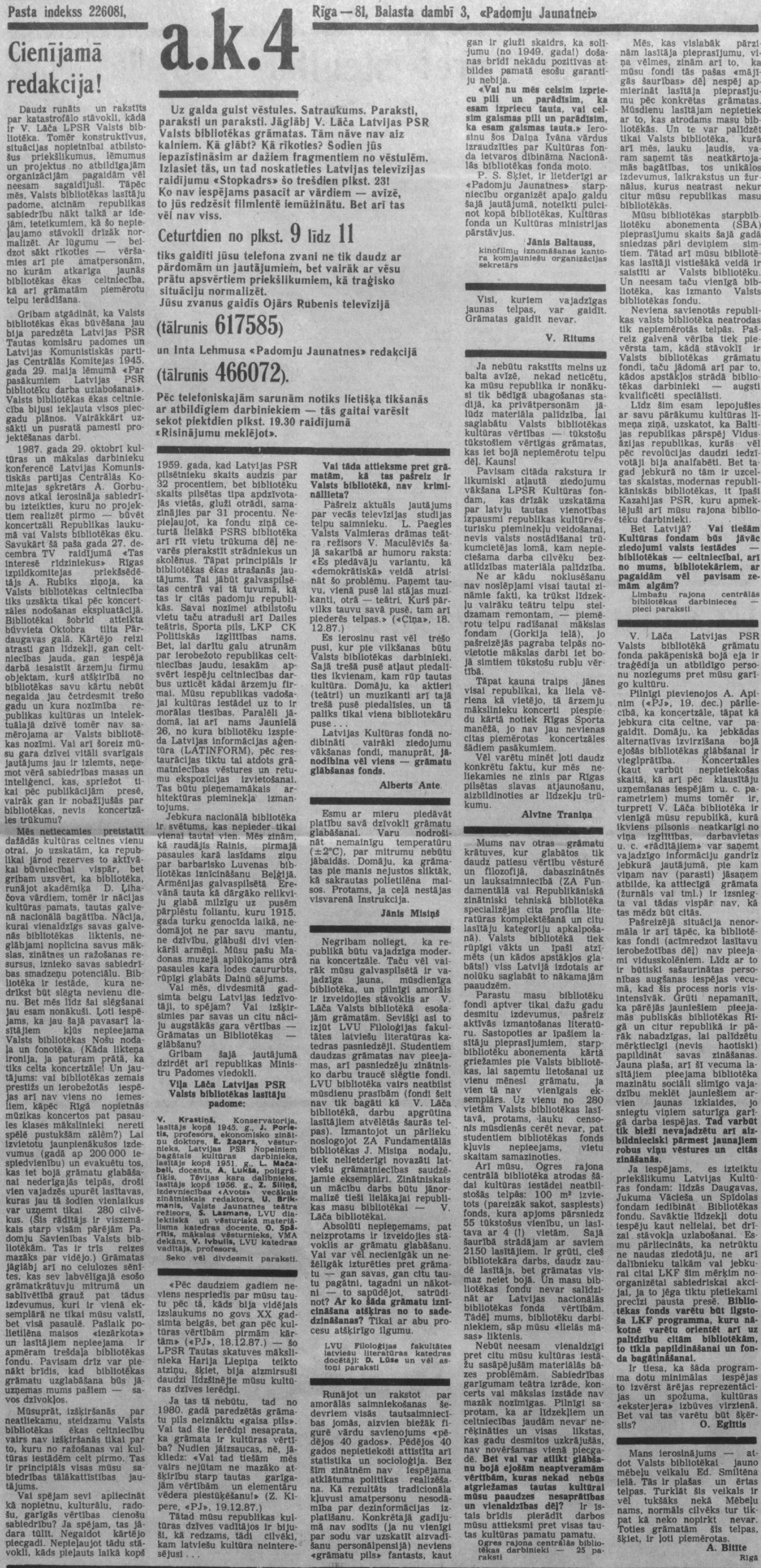 Daudz runāts un rakstīts par katastrofālo stāvokli, kādā ir V. Lāča LPSR Valsts bibliotēka. Tomēr konstruktīvus, situācijas nopietnībai atbilstošus priekšlikumus, lēmumus un projektus no atbildīgajām organizācijām pagaidām vēl neesam sagaidījuši. Tāpēc mēs, Valsts bibliotēkas lasītāju padome, aicinām republikas sabiedrību nākt talkā ar idejām, ieteikumiem, kā šo nepieļaujamo stāvokli drīzāk normalizēt. Ar lūgumu — beidzot sākt rīkoties — vēršamies arī pie amatpersonām, no kurām atkarīga jaunās bibliotēkas ēkas celtniecība, kā arī grāmatām piemērotu telpu ierādīšana.