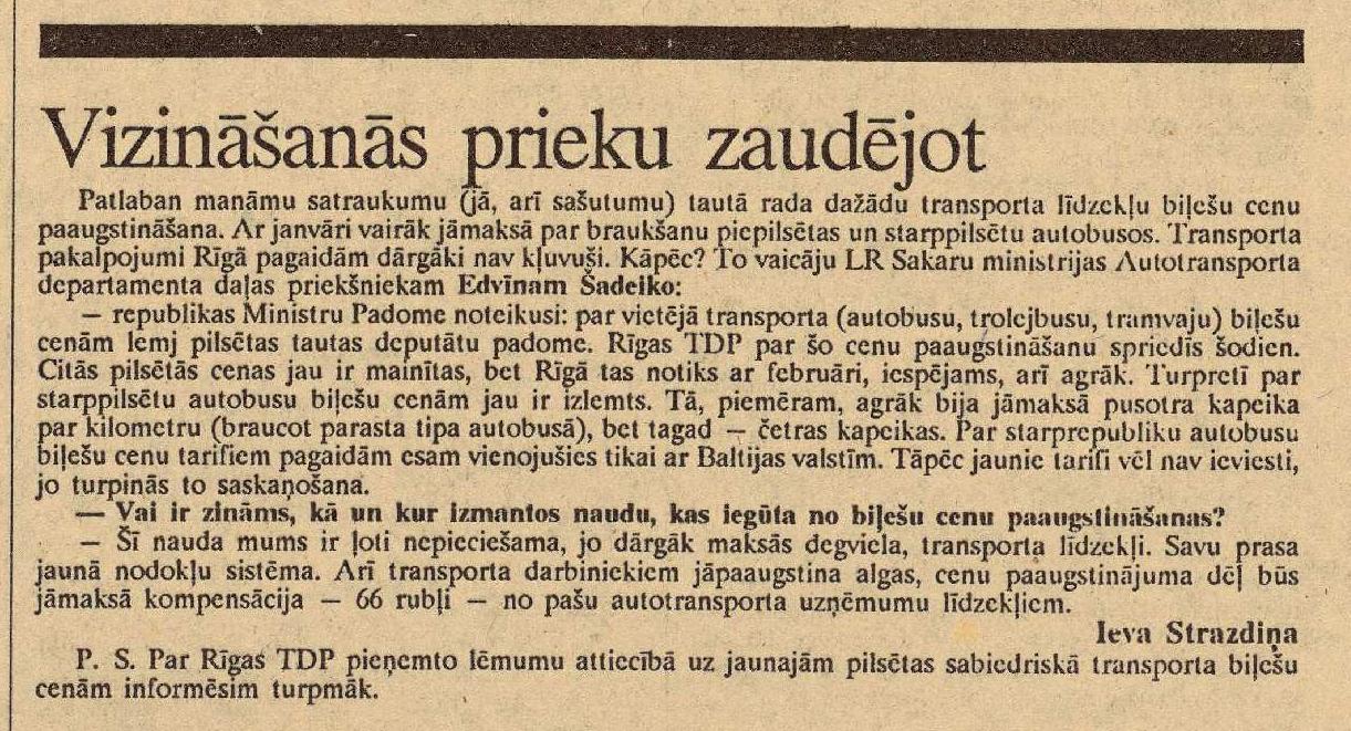 — republikas Ministru Padome noteikusi: par vietējā transporta (autobusu, trolejbusu, tramvaju) biļešu cenām lemj pilsētas tautas deputātu padome. Rīgas TDP par šo cenu paaugstināšanu spriedīs šodien. Citās pilsētās cenas jau ir mainītas, bet Rīgā tas notiks ar februāri, iespējams, arī agrāk. Turpretī par starppilsētu autobusu biļešu cenām jau ir izlemts. Tā, piemēram, agrāk bija jāmaksā pusotra kapeika par kilometru (braucot parasta tipa autobusā), bet tagad — četras kapeikas. Par starprepubliku autobusu biļešu cenu tarifiem pagaidām esam vienojušies tikai ar Baltijas valstīm. Tāpēc jaunie tarifi vēl nav ieviesti, jo turpinās to saskaņošana.